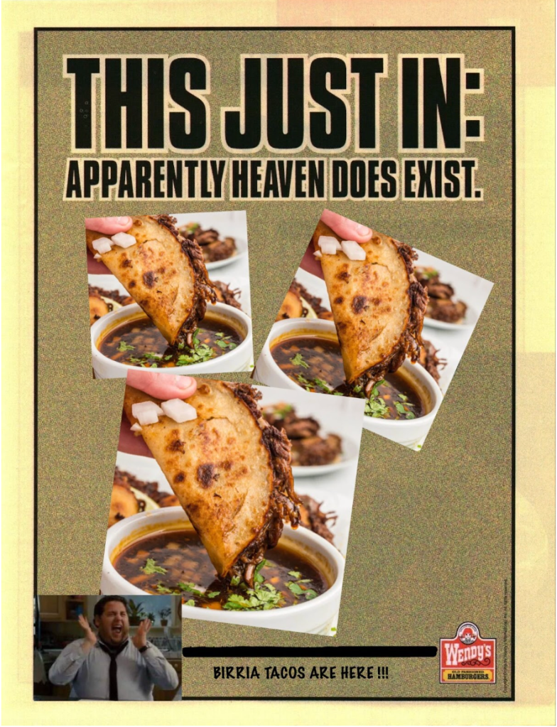 Product- The new “Birria Meal” at Wendy’s will include; 2 tacos, a 4 oz cup of fresh vegetable toppings (onions, cilantro, radish, and slices of lime), an 8 oz cup of consumé, and 1 medium drink. The quality and flavor of the tacos and consomé are important because customers are going to want to pay a reasonable price for the amount of flavor and taste in the food they are getting.